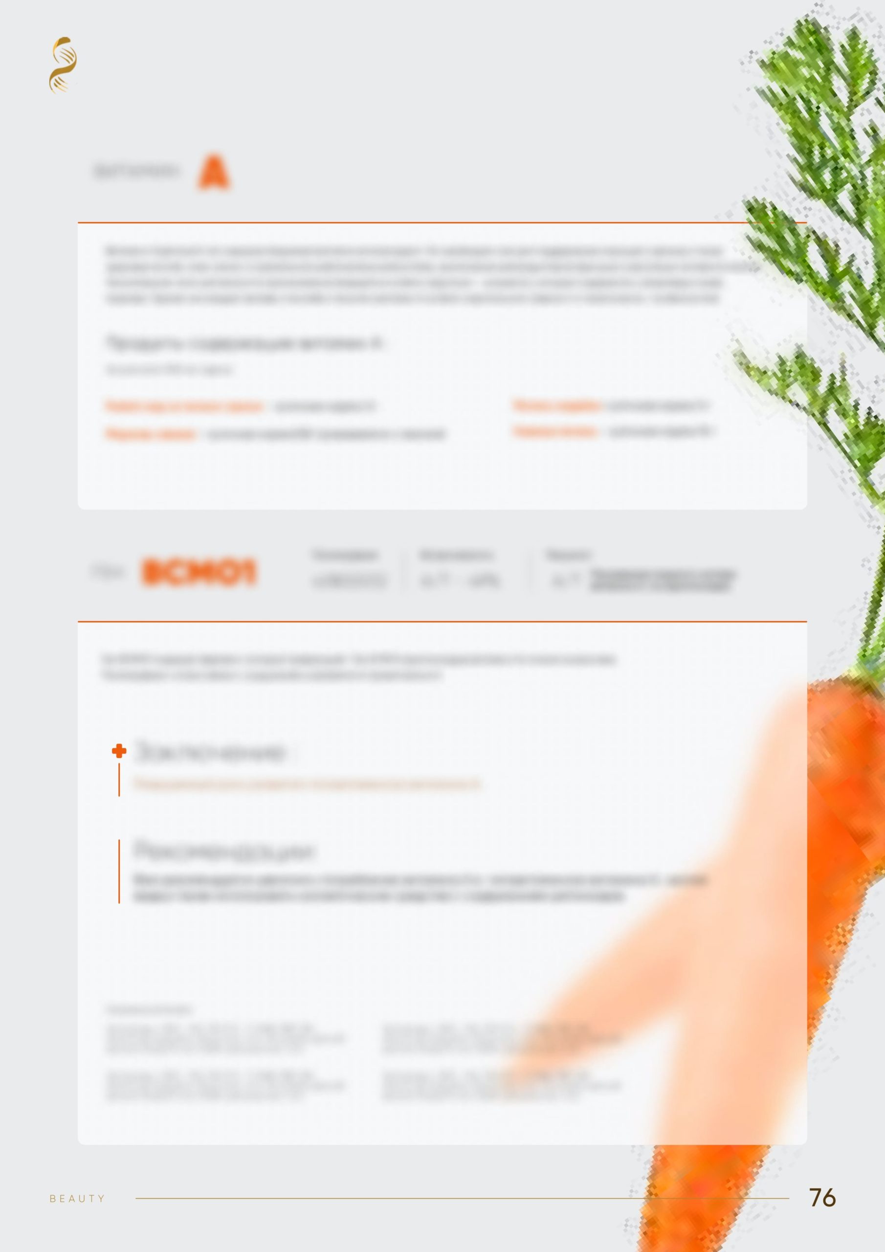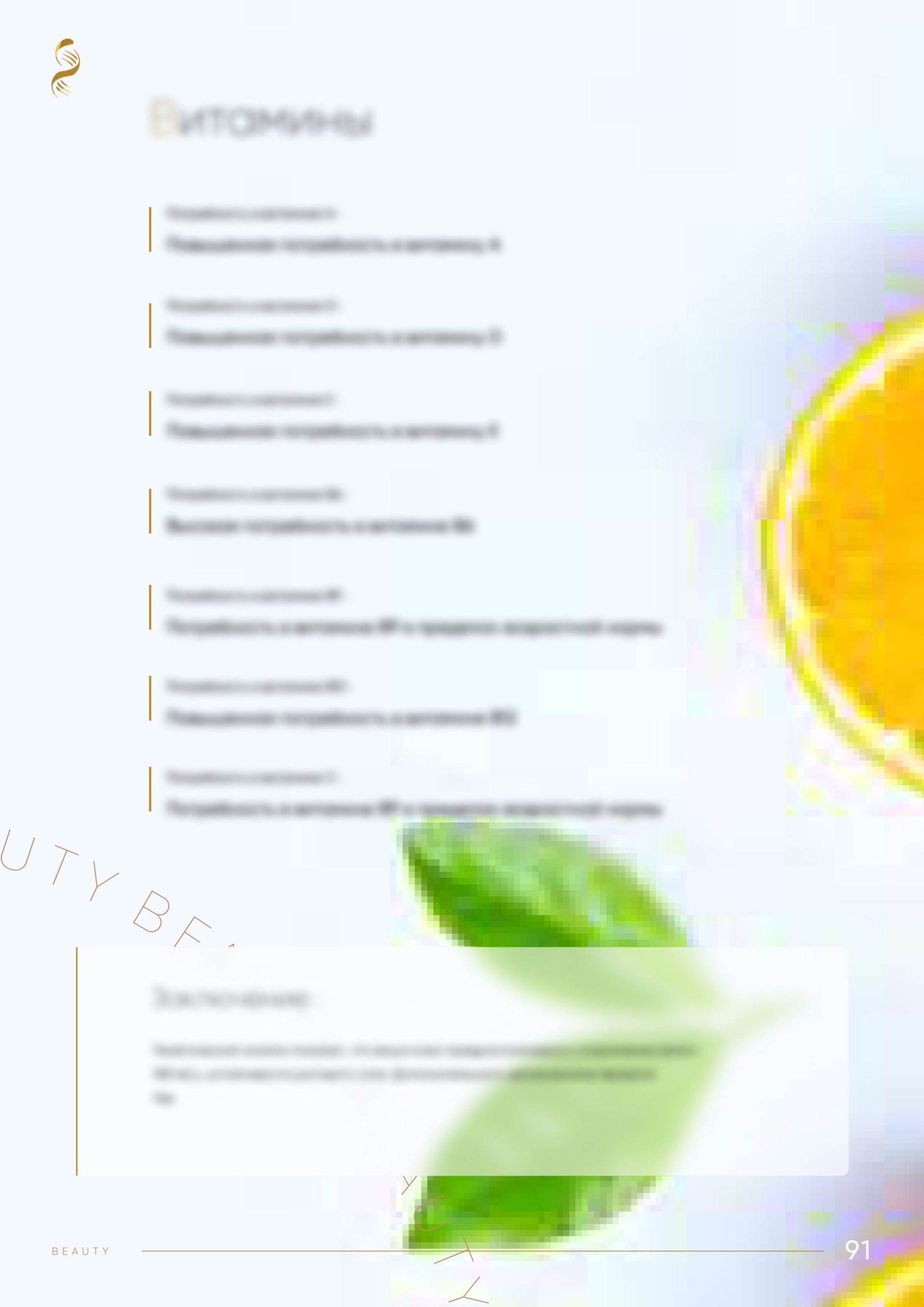 - Метаболизм витаминов и потребность (A, B6, B9, B12, C, D, E).